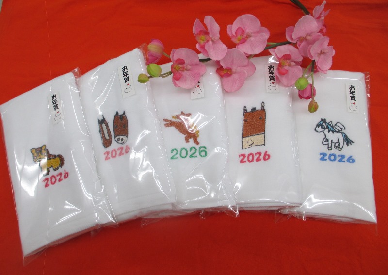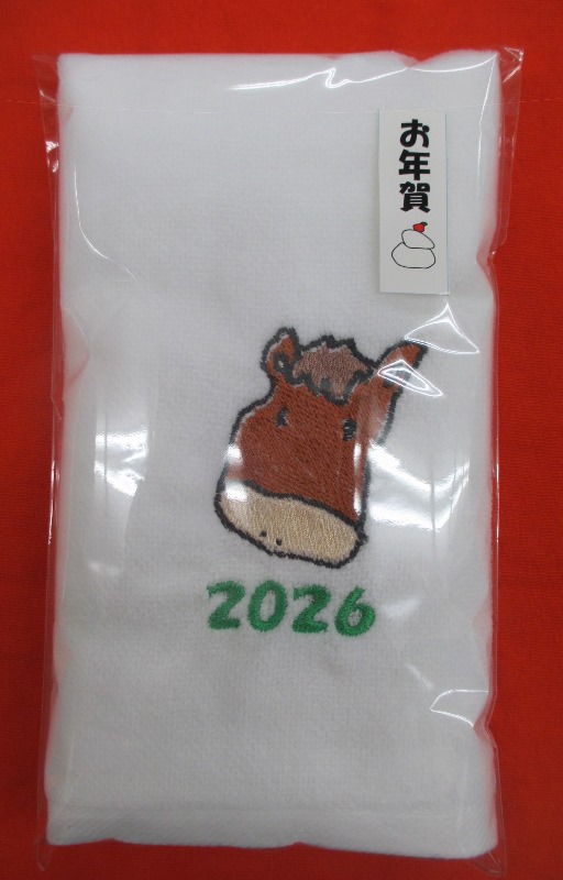| お年賀タオル 450円 (税込) 会社名などの刺しゅうも入れられます。10枚から。 フェイスタオル白 約34cm×85cm |